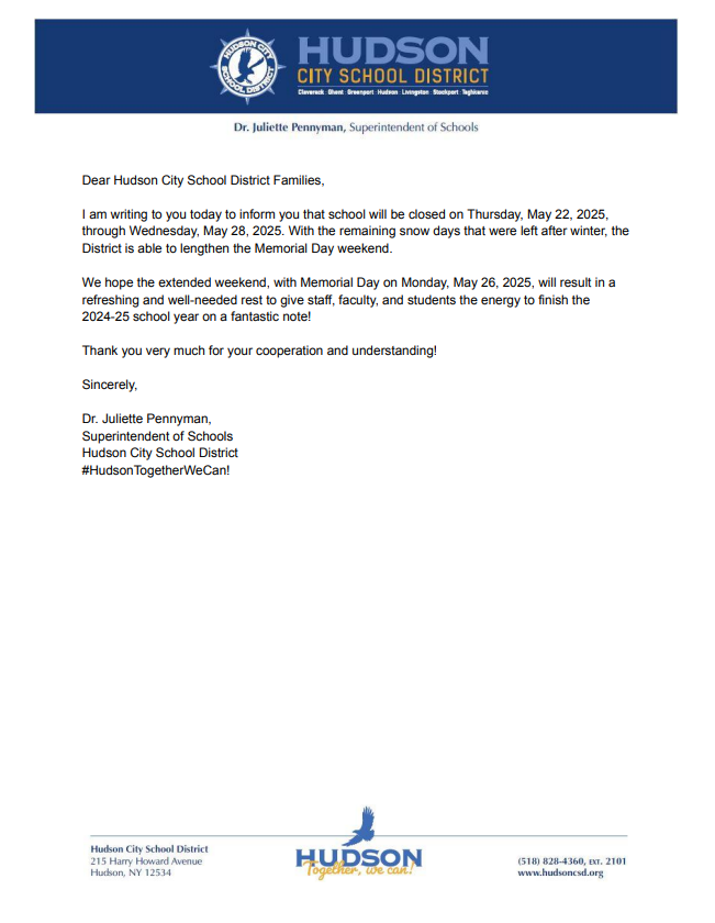 I am writing to you today to inform you that school will be closed on Thursday, May 22, 2025, through Wednesday, May 28, 2025. With the remaining snow days that were left after winter, the District is able to lengthen the Memorial Day weekend.