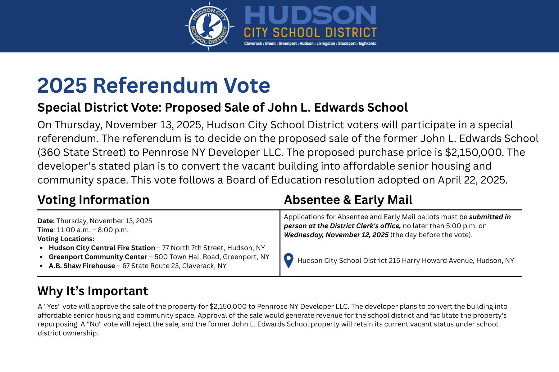 On Thursday, November 13, 2025, Hudson City School District voters will decide whether to approve the sale of the former John L. Edwards Elementary School, located at 360 State Street, Hudson, to Pennrose NY Developer LLC (or its assignee). Pennrose has proposed to purchase the property for $2,150,000 and convert the school building into affordable housing and community space.