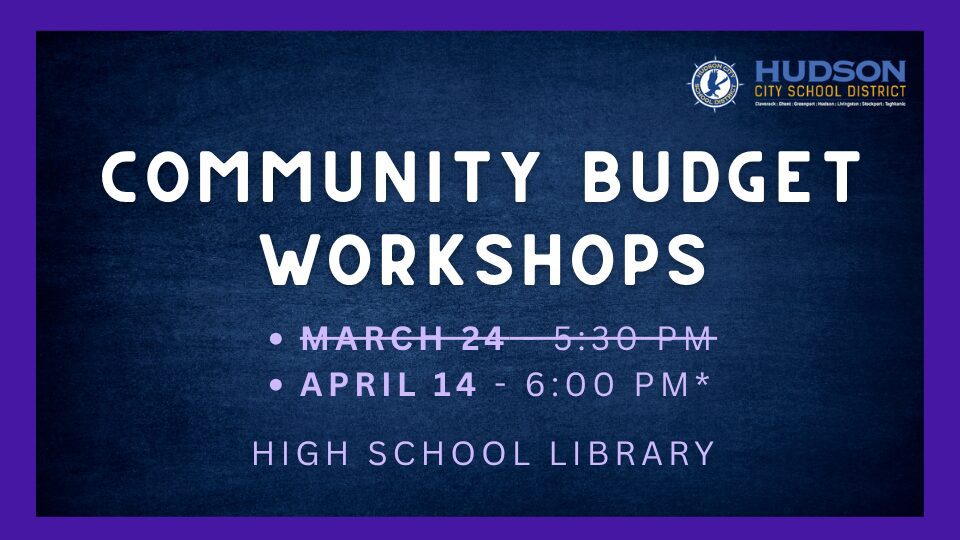 NOTICE: Board of Education – Community Budget Workshop coming up! The next one will be April 14 at 6pm at the Sr. High School Auditorium, not Library*