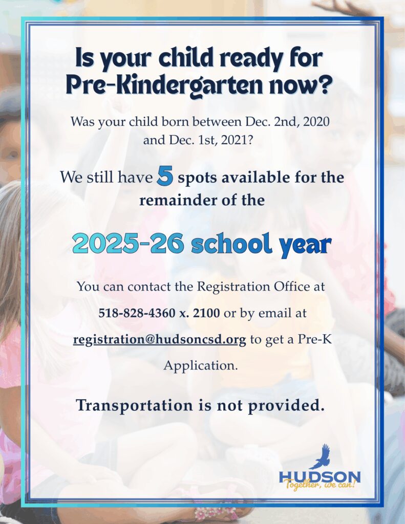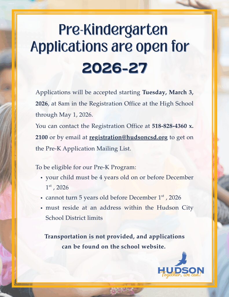 The Hudson City School District is excited to continue it’s expanded Pre-Kindergarten programs for the 2026 – 2027 school year because of continued funding from New York State to support Universal Pre-K (UPK) for four-year-old children.